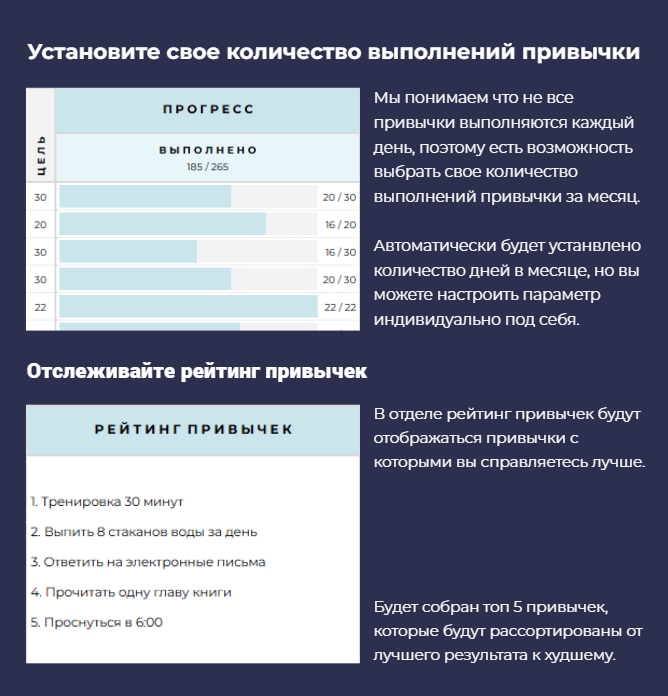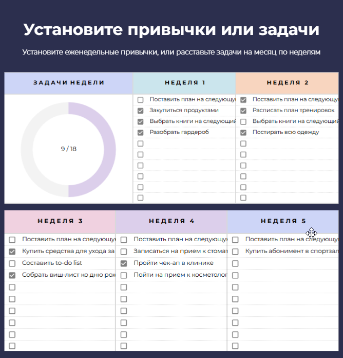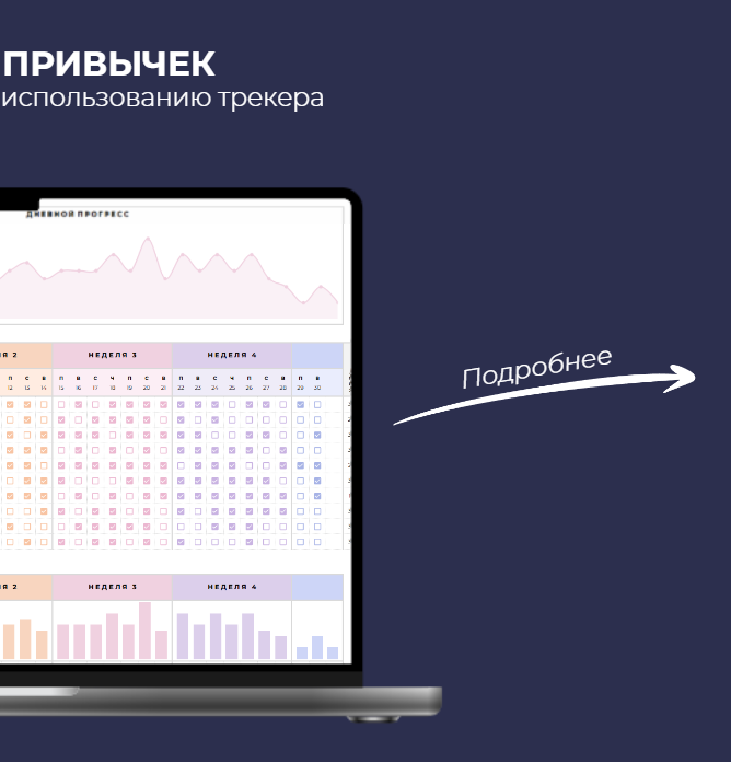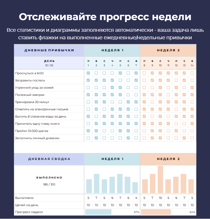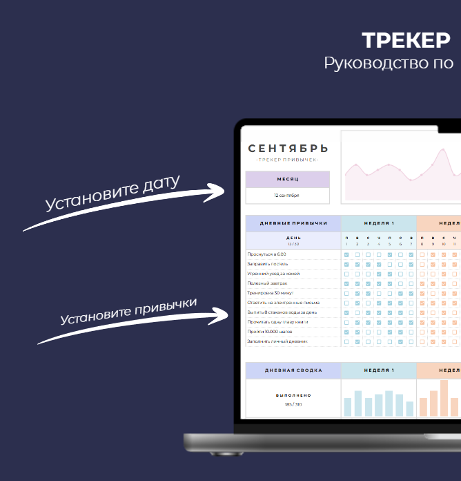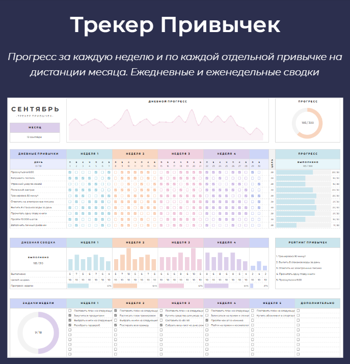 Сохраняйте последовательность и мотивацию в формировании полезных привычек с помощью этой таблицы Habit Tracker. Этот шаблон, созданный для того, чтобы помочь вам выработать привычки, является идеальным инструментом для достижения целей, позитивных изменений и улучшения вашего образа жизни. Он включает в себя только самое необходимое и при этом прост, понятен и визуально привлекателен. Всё, что вам нужно сделать, — это настроить свои привычки, отметить галочками нужные пункты, а всё остальное будет рассчитано автоматически!